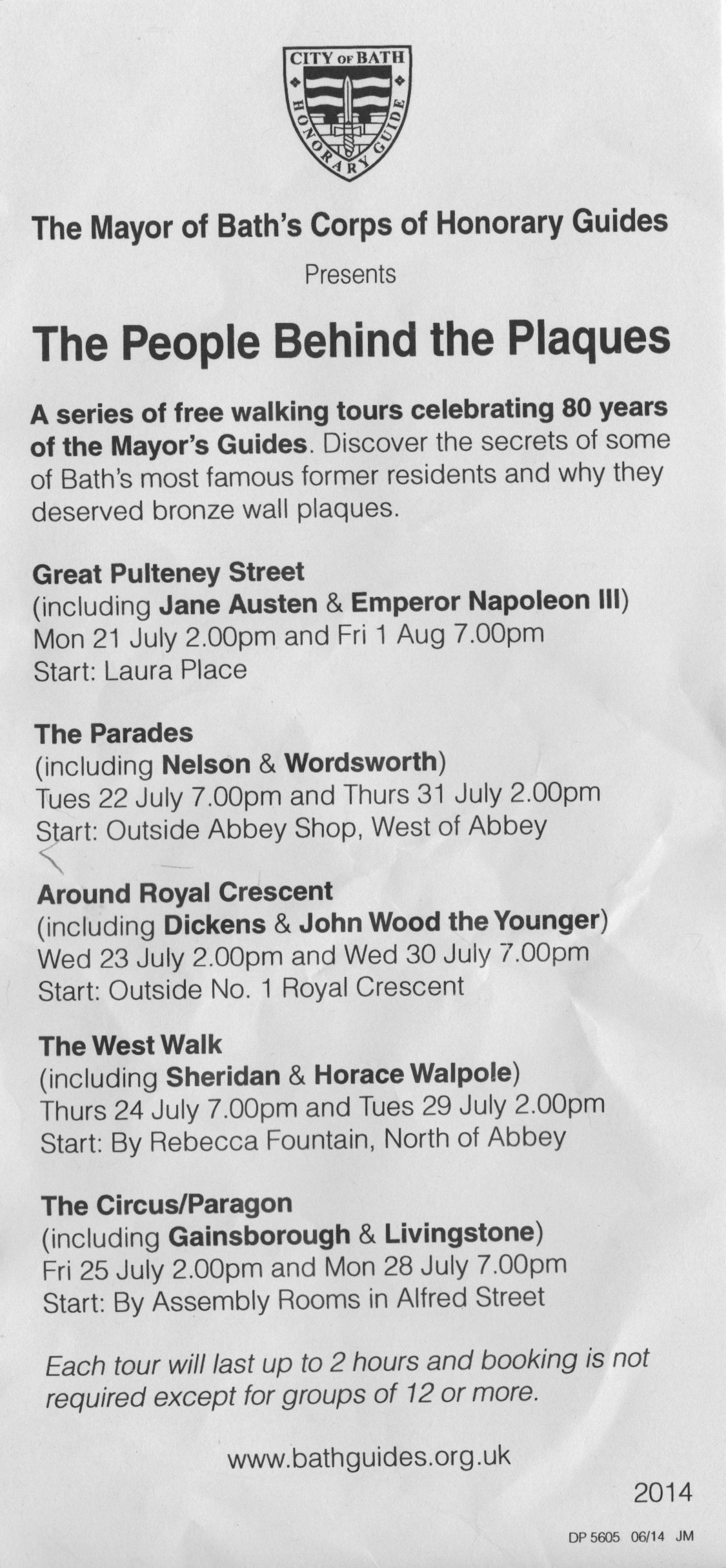 The Mayor of Bath’s Corps of Honorary Guides is celebrating its 80th birthday with an additional series of free walking tours which celebrates some of the ‘celebrity’ names behind the bronze wall plaques dotted around the city.