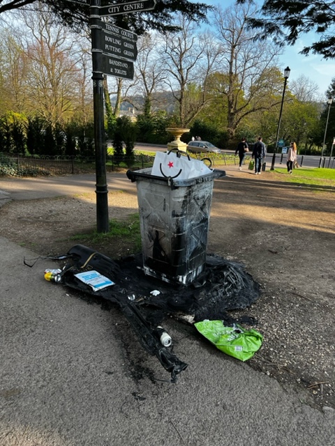‘This mega-bin on the Gravel Walk met a sad end today – probably due to a smouldering BBQ (banned on the Lower Lawn) being thrown in!’